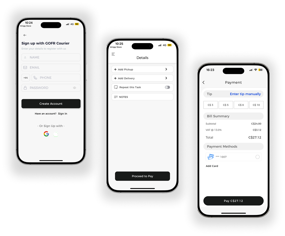 GOFR, a courier service provider, sought to modernize and streamline their on-demand pick-up and delivery operations. DEVtrust was tasked with developing an app to facilitate secure, efficient, and automated transactions for both personal and business courier needs. By leveraging advanced technologies, including Google Maps APIs and Tookan’s API, we delivered a comprehensive solution that enhanced GOFR’s service offering and improved customer experience.
